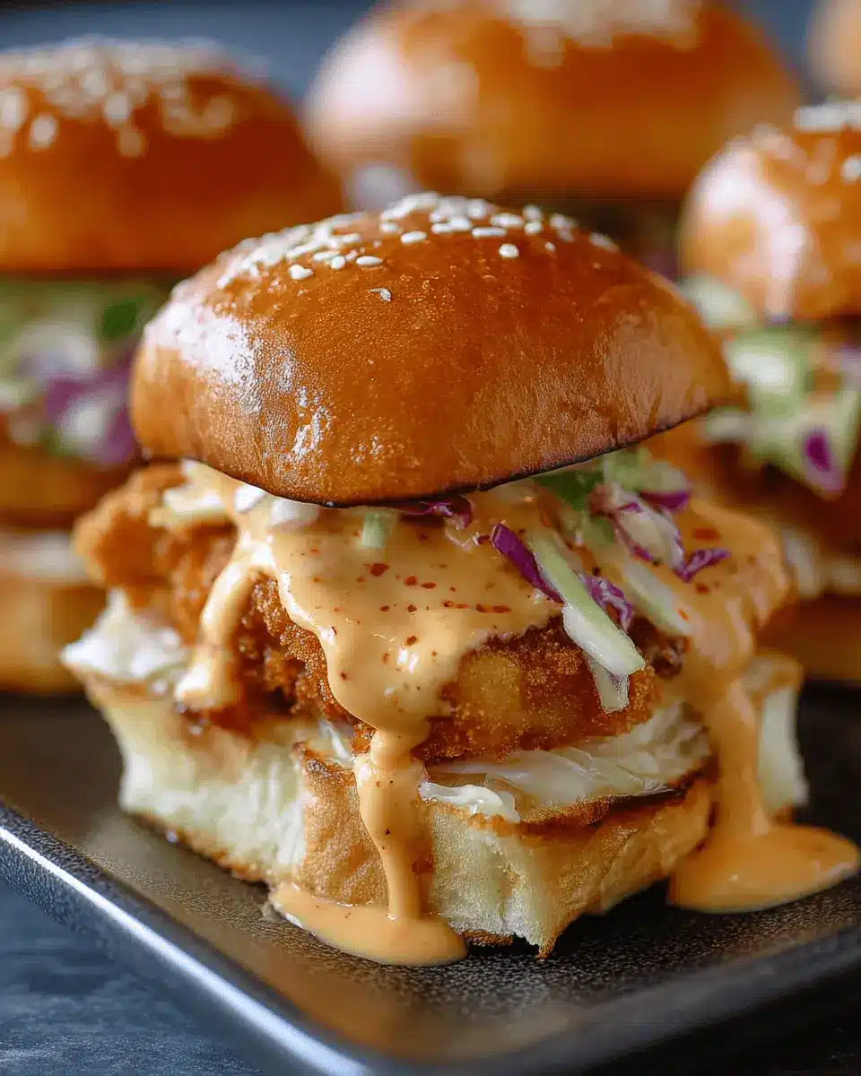 Finally, it’s time to assemble your Bang Bang Chicken Sliders! Cut your crispy chicken cutlets into smaller pieces to fit perfectly on your slider rolls. Place a piece of warm, crispy chicken on each bun, then top it with a slice of gooey mozzarella cheese—because who doesn’t love melty cheese? Drizzle generously with that delicious Bang Bang Sauce, and voilà! Your sliders are ready to devour and impress at any gathering. Serve them warm and watch your guests go wild!