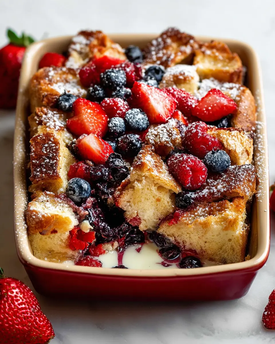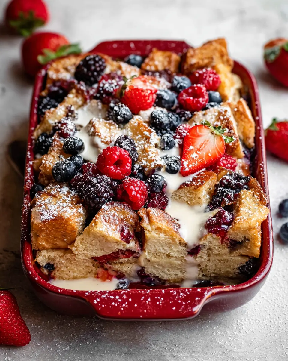 While the classic Berries & Cream French Toast Casserole is delightful with mixed berries, feel free to get creative! Substitute or add seasonal fruits like raspberries, diced peaches, or even cherries for a unique twist. Each berry brings its own flavor profile, enhancing the creamy richness of the dish. Just remember to adjust the sweetness accordingly for tart fruits.