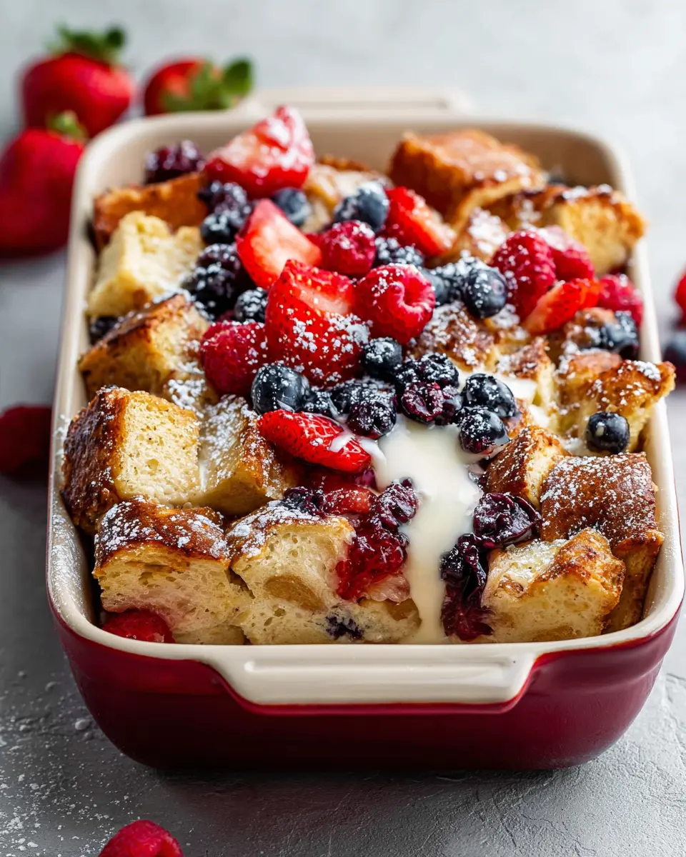 Once it’s done, dust with confectioners’ sugar and add a drizzle of maple syrup for a touch of sweetness. This Berries & Cream French Toast Casserole is not just a breakfast; it's an experience!