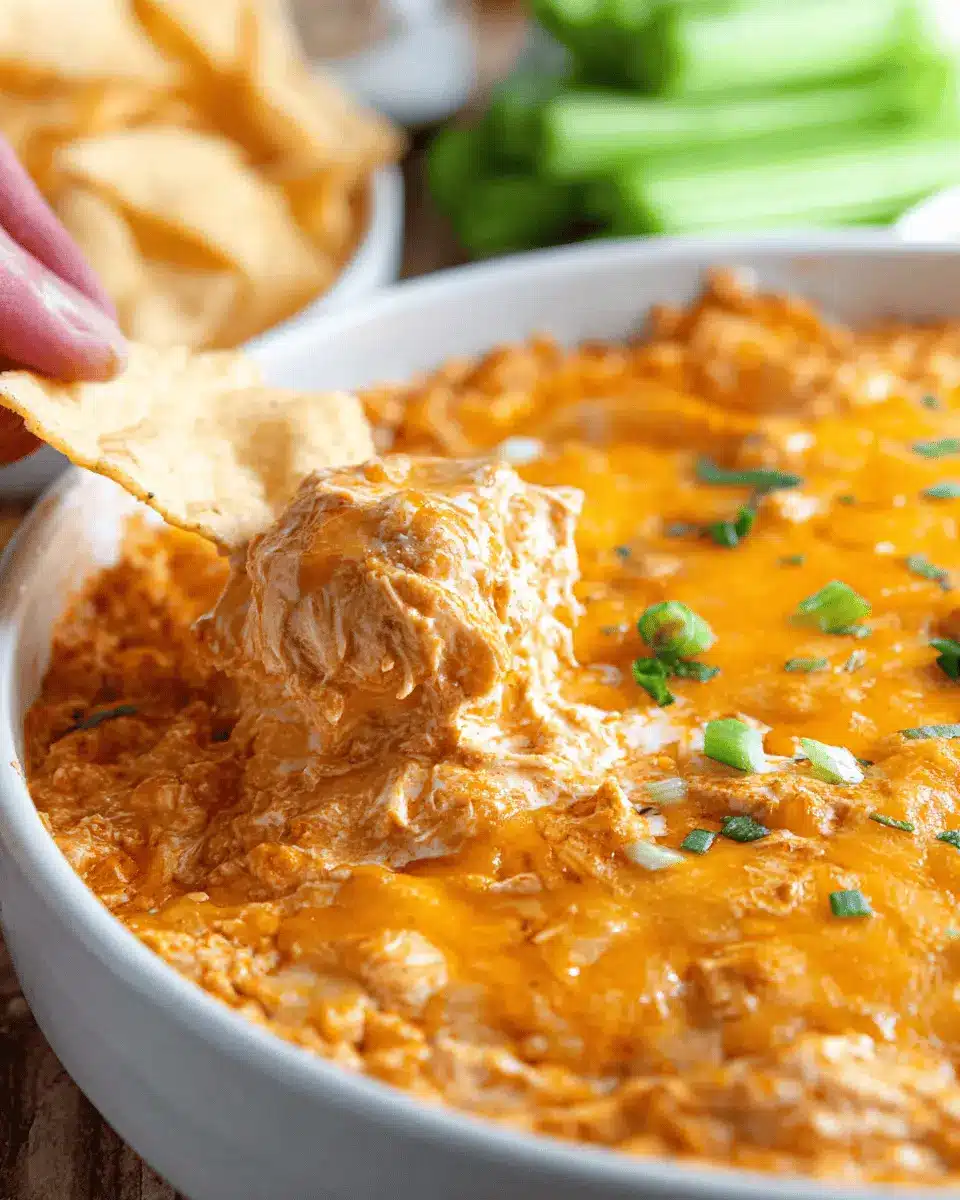 Once your buffalo chicken dip is out of the oven, it’s time to elevate it further! Drizzle some blue cheese or ranch dressing over the top for a fresh flavor contrast. This step adds a bit of visual appeal, too. Serve immediately with your choice of Fritos, baguette slices, or crunchy veggies. Trust me, this yummy appetizer will be the star of your gathering!