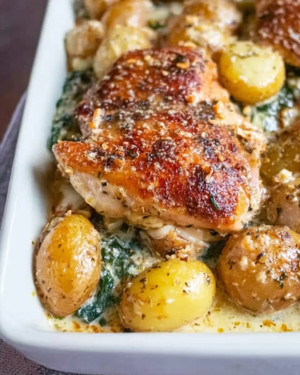 - Pour the spinach and cream sauce over top of the chicken and potatoes.
