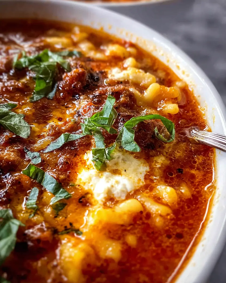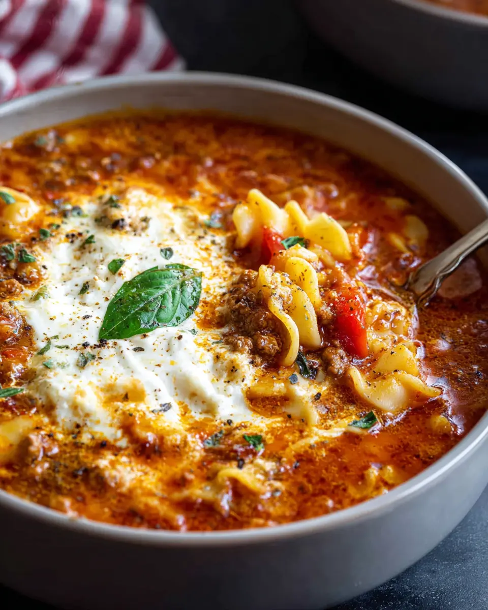 Ladle your lasagna soup into bowls, and don’t forget to scoop a generous dollop of that cheesy goodness on top. Garnish each bowl with fresh basil for a pop of color and flavor. The result? A warm, comforting dish that feels just like traditional lasagna, but in a deliciously soupy form! Enjoy your creation, and feel free to share your experience or variations with others. Happy cooking!
