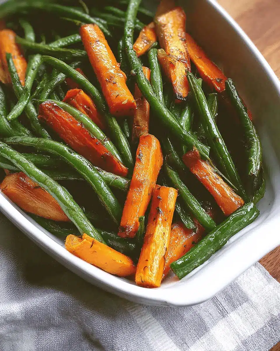 Elevate your dining experience by showcasing roasted green beans and carrots in a visually appealing way. Use a long, white plate for a modern touch, artfully stacking the vegetables and proteins. A sprinkle of sesame seeds or a drizzle of balsamic glaze can create an inviting contrast that’s as pleasing to the eyes as it is to the palate.
