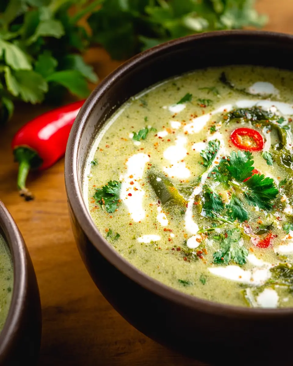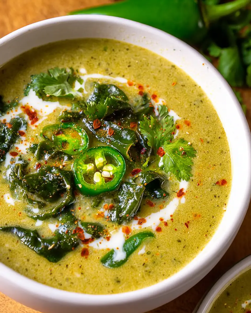 Return the blended mixture to the stove and let it simmer for another 5-10 minutes. Taste for seasoning and adjust with more salt if needed. Serve your soup piping hot, garnished with a drizzle of Mexican crema, finely chopped cilantro stems, freshly cracked pepper, and a splash of hot sauce for that kick. The vibrant garnishes will not only amp up the flavor but also add a lovely visual appeal to your roasted poblano soup.