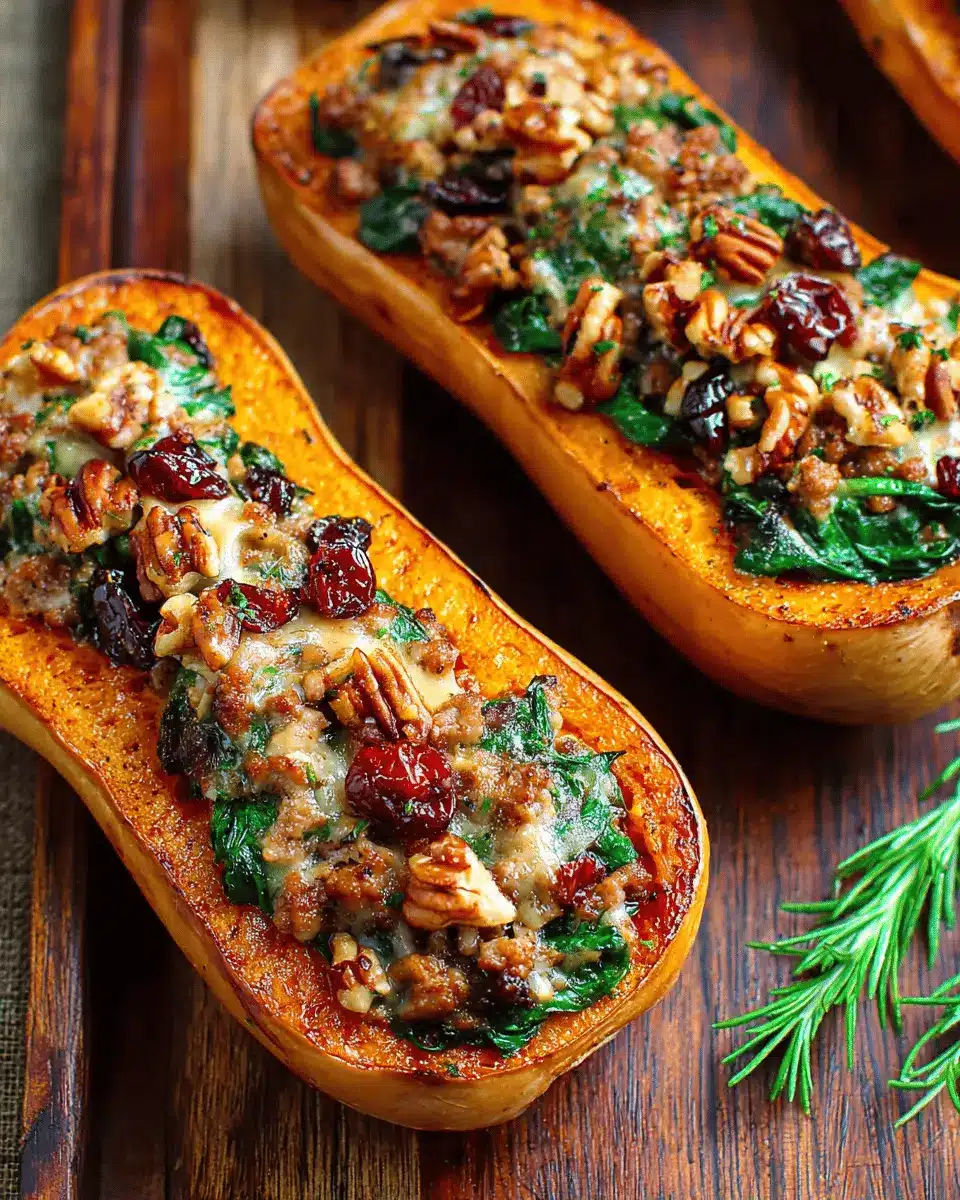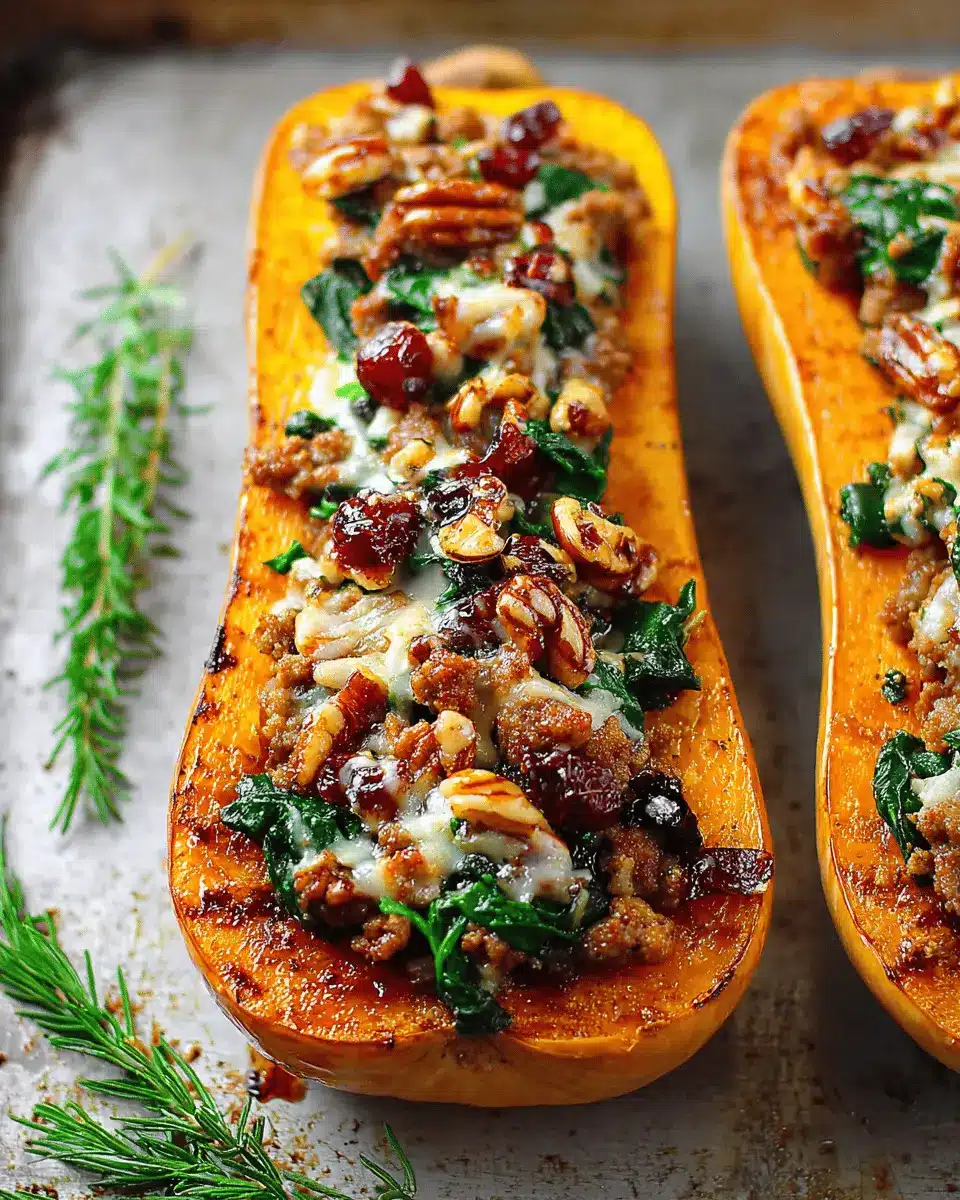 Sausage Stuffed Butternut Squash with Spinach, Pecans, and Cranberries