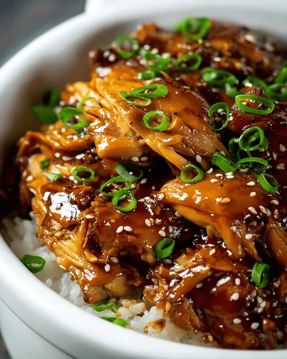 To serve your slow cooker teriyaki chicken, pour the thickened sauce over the shredded chicken and toss to coat thoroughly. Garnish with sesame seeds and sliced green onions for a burst of color and flavor. This dish is best enjoyed over a bed of rice or with steamed vegetables.
