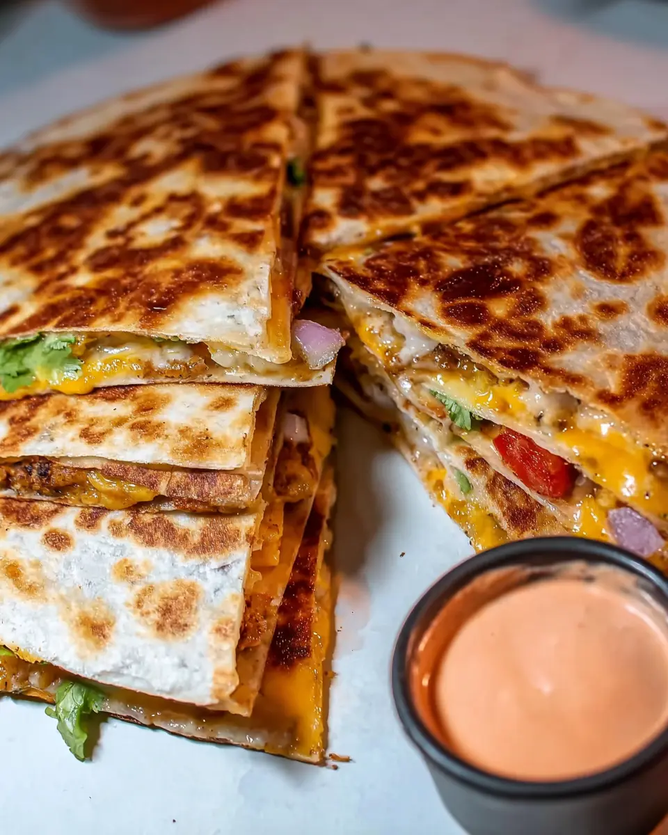 Finally, it’s time to slice and serve your delicious culinary creation! Cut each quesadilla into six equal triangles. For a fresh touch, add shredded iceberg lettuce on top and drizzle that special sauce you made earlier over the quesadillas or serve it on the side.