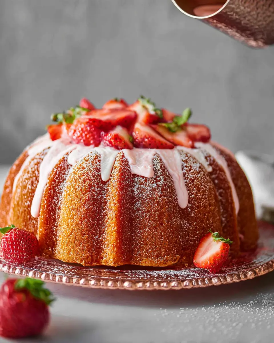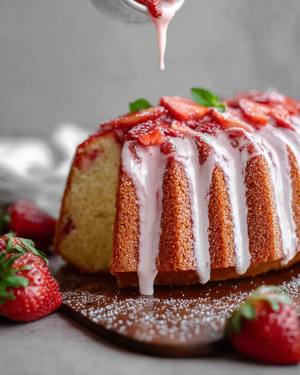 To make your strawberry pound cake shine, place it elegantly on a decorative cake stand. Drizzle the luscious strawberry glaze over the top, letting it cascade down the sides for a beautiful effect. Garnish with sliced strawberries or edible flowers for a pop of color, making it not just a dessert, but a centerpiece for any gathering.